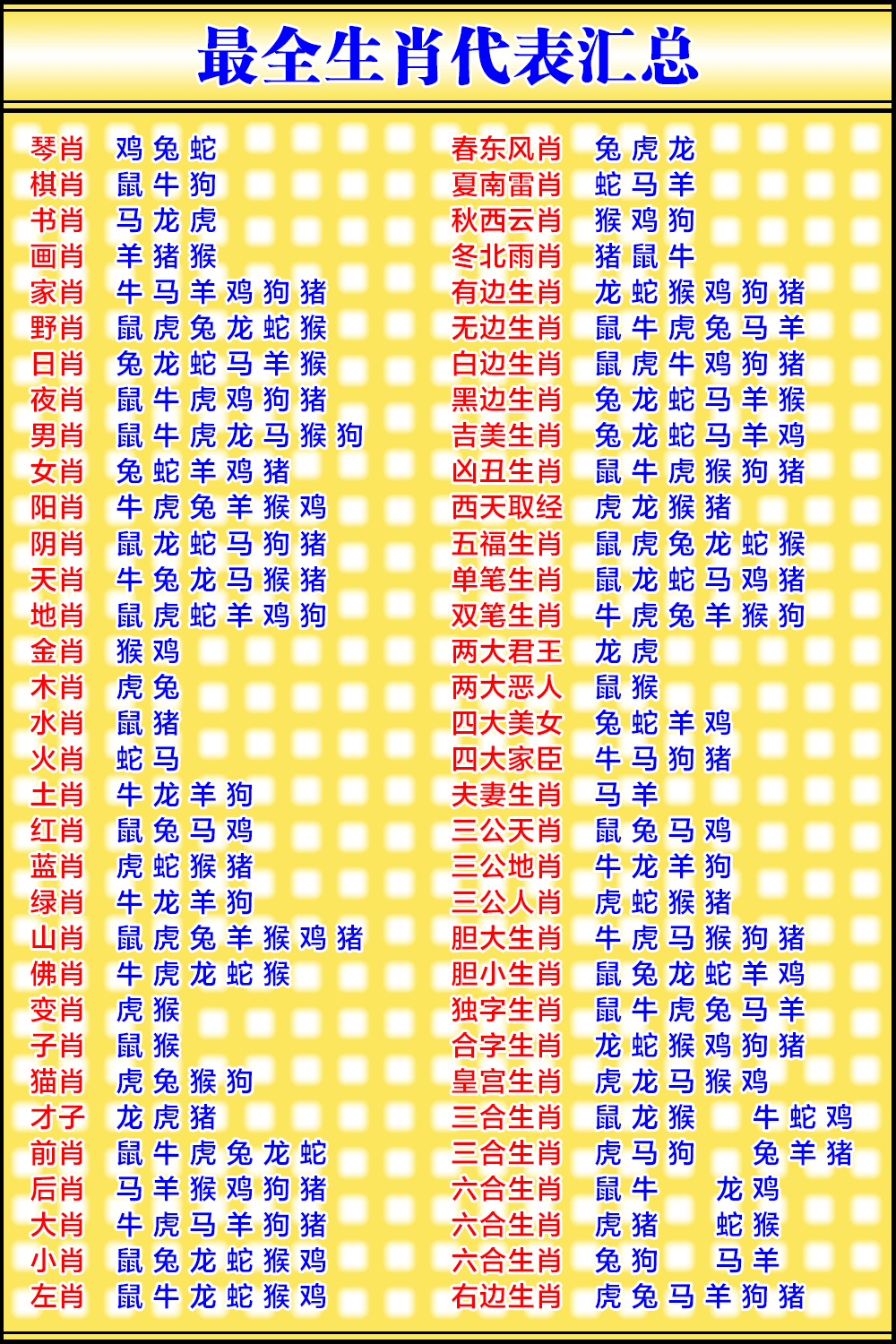 琴:兔鸡蛇 棋:鼠牛狗